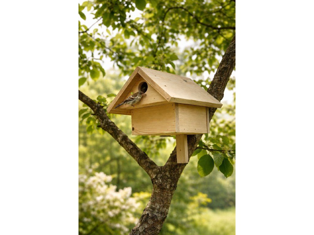 Természetes szlovák fából készült, lakk és vegyszerek nélkül, biztonságos otthont nyújt a kismadaraknak - például cinegéknek, verebeknek vagy csuszkáknak.