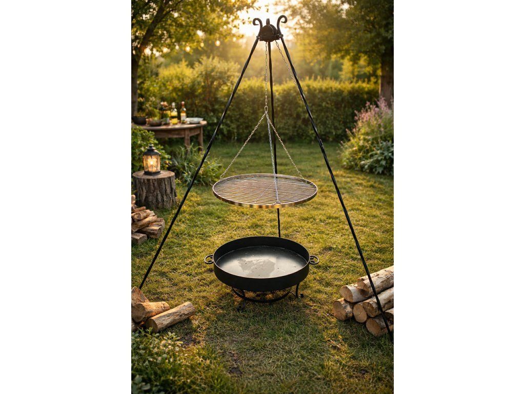 A masszív fém szerkezet nagy stabilitást és hosszú élettartamot biztosít. Az állítható lánccal ellátott háromláb lehetővé teszi a rács magasságának egyszerű szabályozását a tűz fölött, így a hő intenzitása könnyen az igényekhez igazítható.
